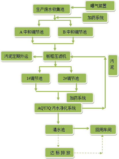 该类污水酸性较强,首先在中和池内加入碱液进行中和,中和过程中产生大量的污泥,我们通过板框压滤机将泥水分离,这样确保后端处理时污泥对药剂产生消耗和影响,中和后的污水进入污水调节池。